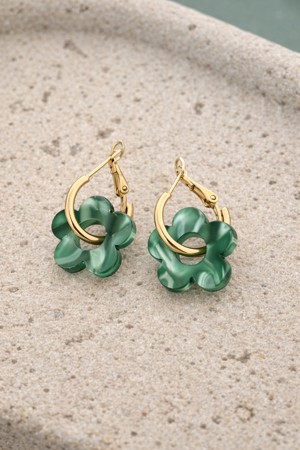 Aretes en forma de flor con aro chapado en oro y charm acrílico. Livianos, cómodos y perfectos para el uso diario.