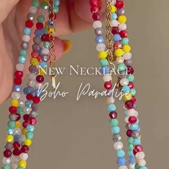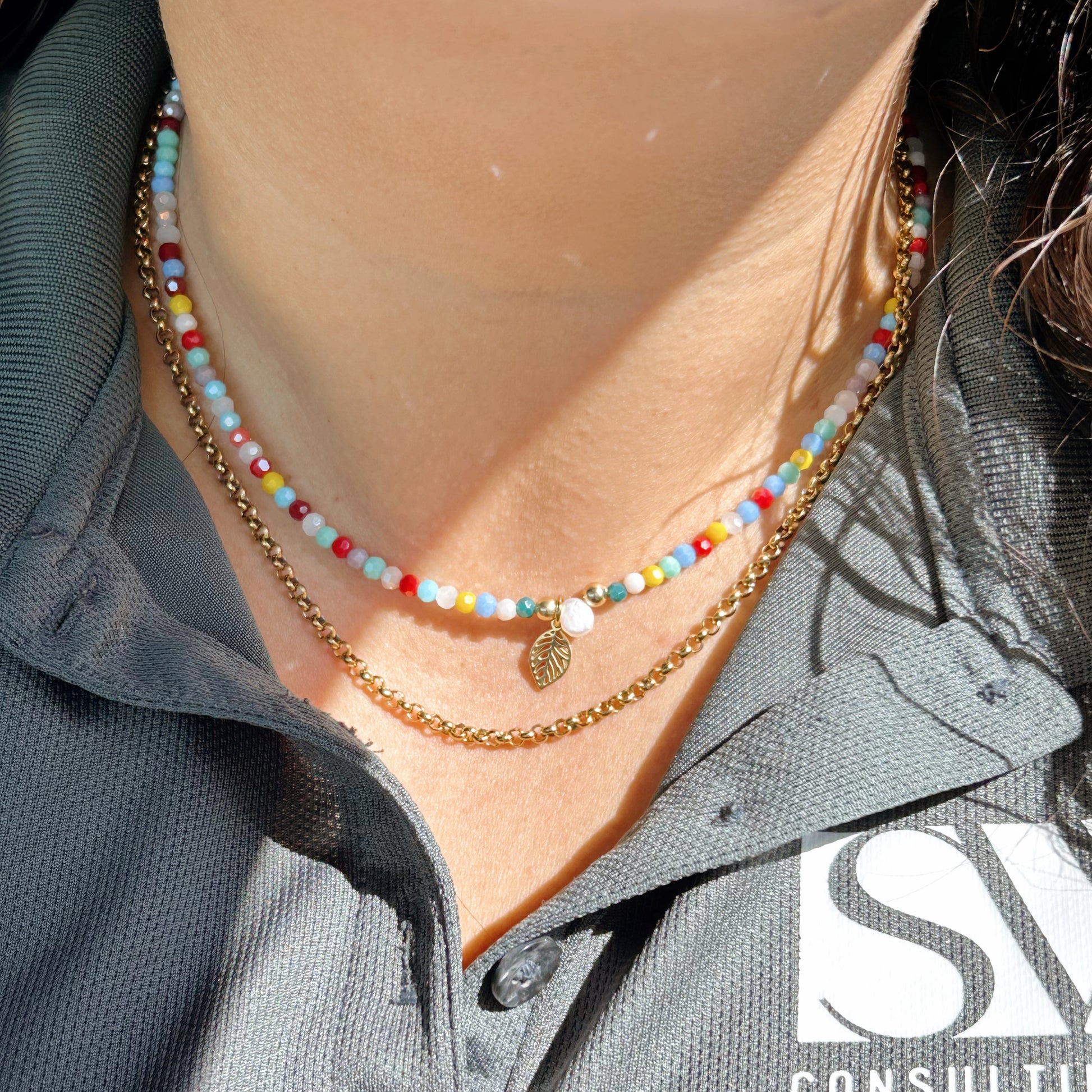 The Boho Paradise Necklace is a vibrant and timeless piece that brings color and elegance to your everyday style. Designed with multicolor faceted crystal rondelles, a cultured freshwater pearl, and gold stainless steel leaf charms, this necklace blends bohemian charm with durability.