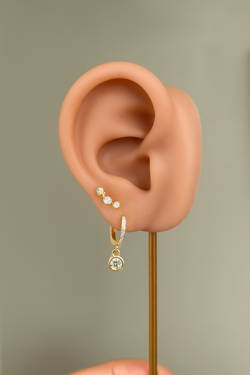 Includes: 2 triple zirconia stud + 2 gold hoop with round drop