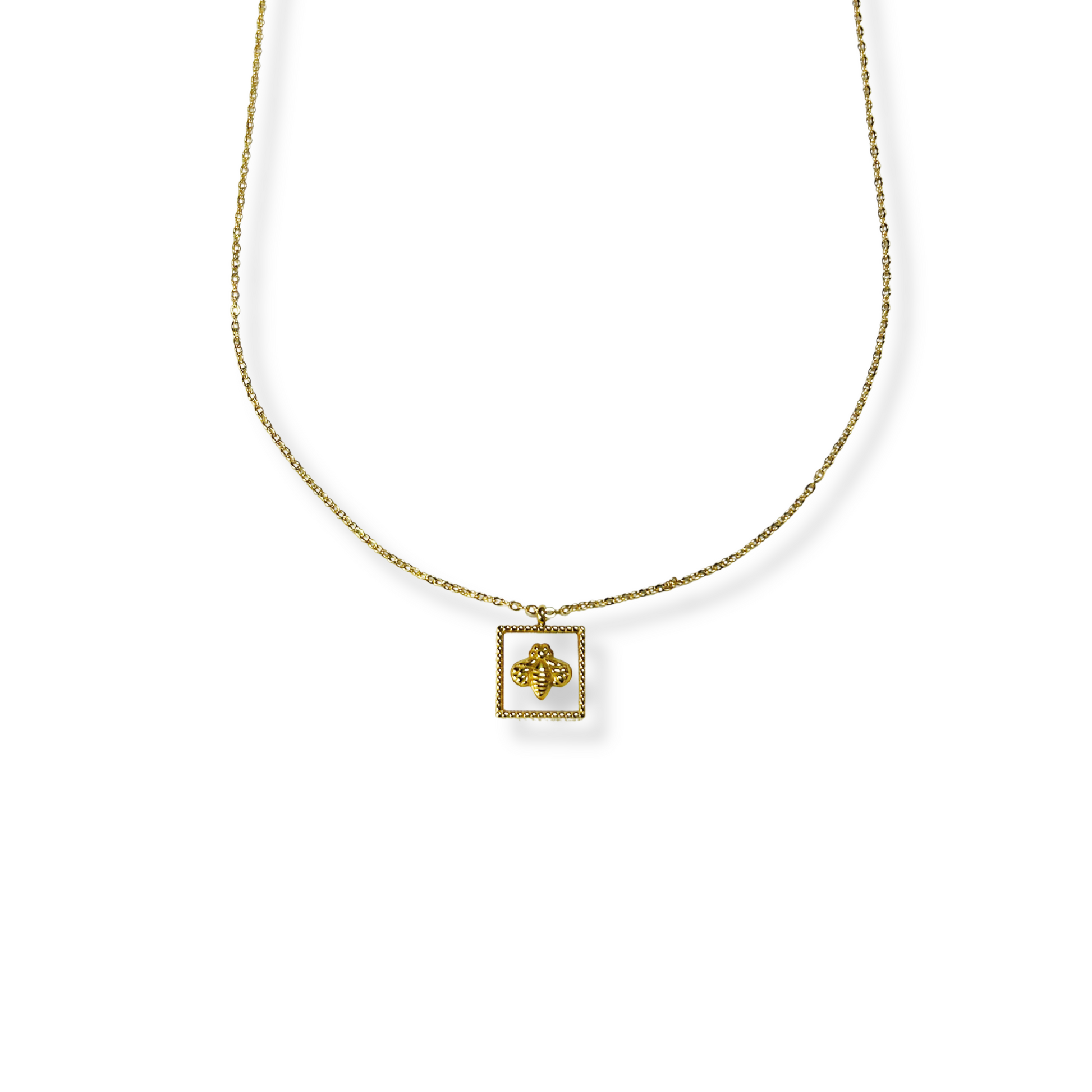 A unique and stylish design. This gold stainless steel necklace features a square pendant with a white background and a raised bee 🐝, symbol of hard work, abundance, and positive energy. Waterproof and perfect for everyday wear.
