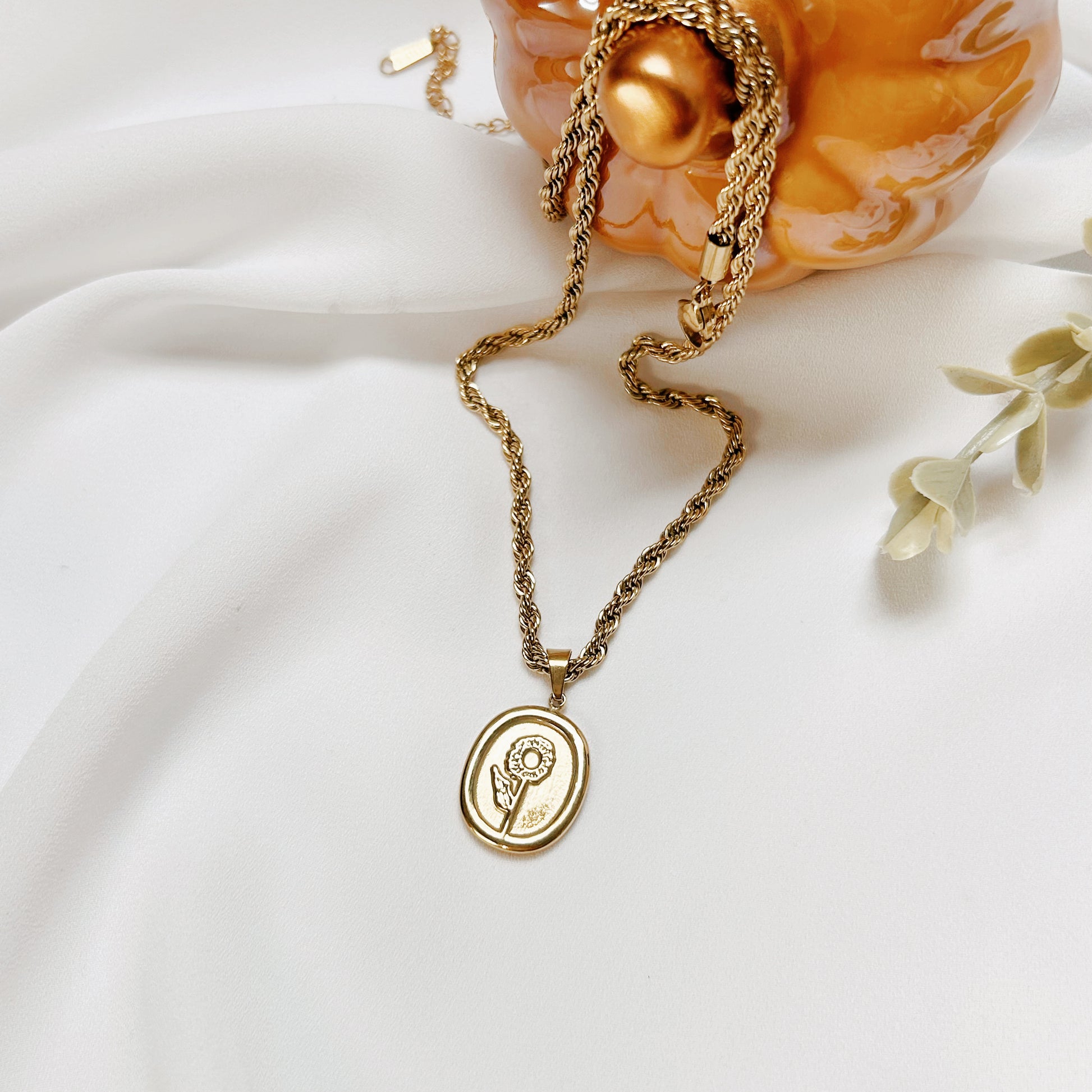 This elegant gold necklace features an oval medallion pendant with a detailed sunflower emboss 🌻. Designed in durable gold stainless steel, it’s resistant to tarnish and water, making it perfect for everyday wear. The twisted rope chain adds a stylish touch, while the sunflower symbolizes strength, positivity, and optimism. A timeless jewelry piece to layer or wear solo.