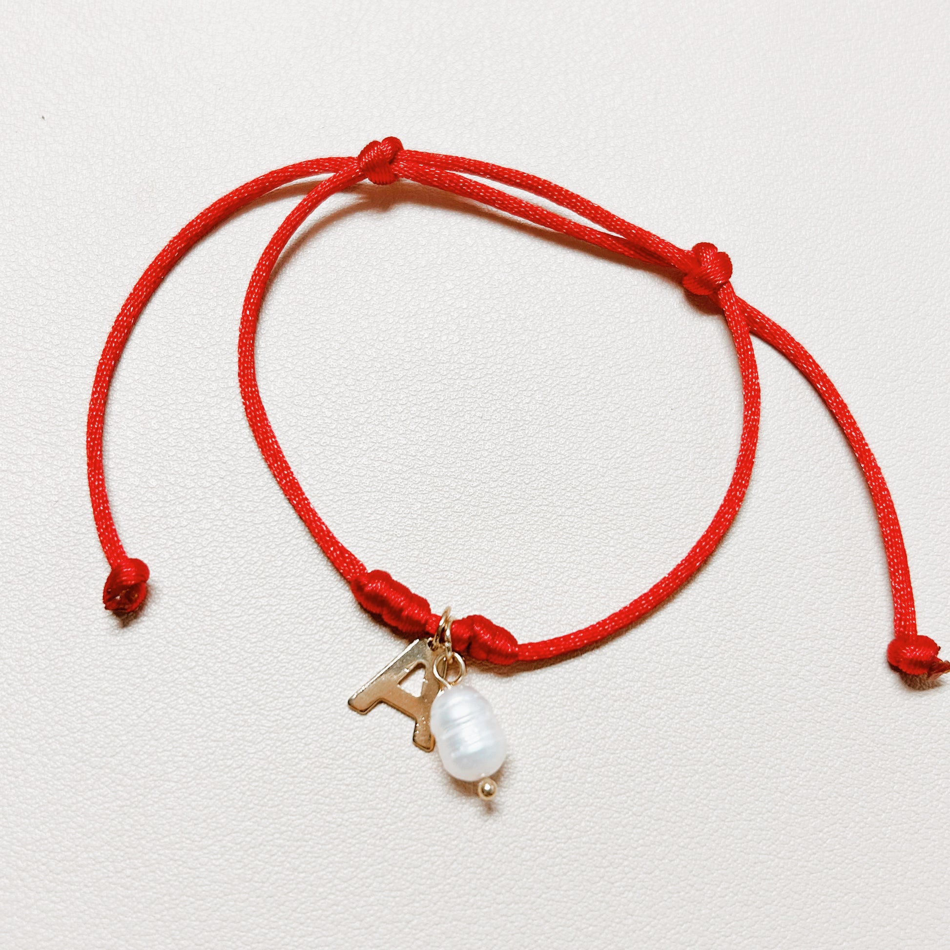 Pulsera ajustable con hilo rojo, letra inicial en dorado y perlita de agua dulce (cada perla puede variar ligeramente en forma). Perfecta para usar sola o combinar.